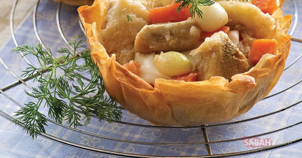 Daha sonra yufka kaselerinin içine paylaştırın. Enginarlı karışımı üzerlerine ekleyin. Dereotu ile süsleyerek servis yapın.