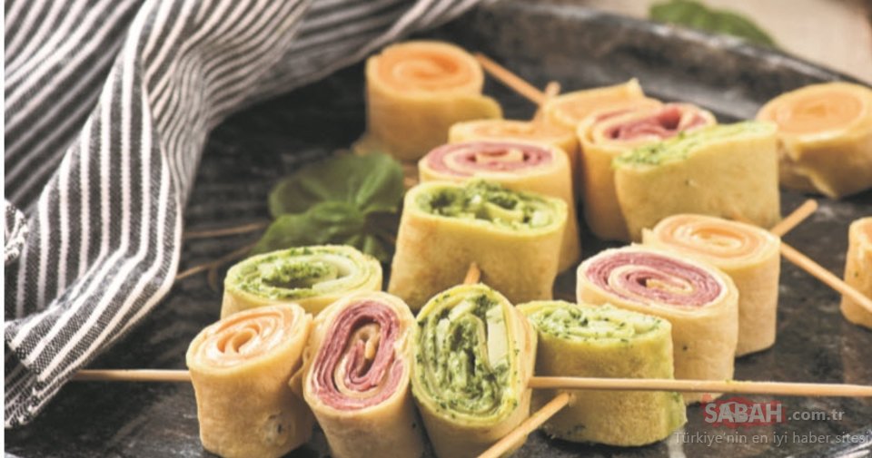 Salamları kreplerin yarısına dizip rulo haline getirin ve yine 2 parmak kalınlığında dilimleyin. Burger peyniri için de aynı işlemi yapıp, kestikten sonra çöp şişlere batırarak servis edin.