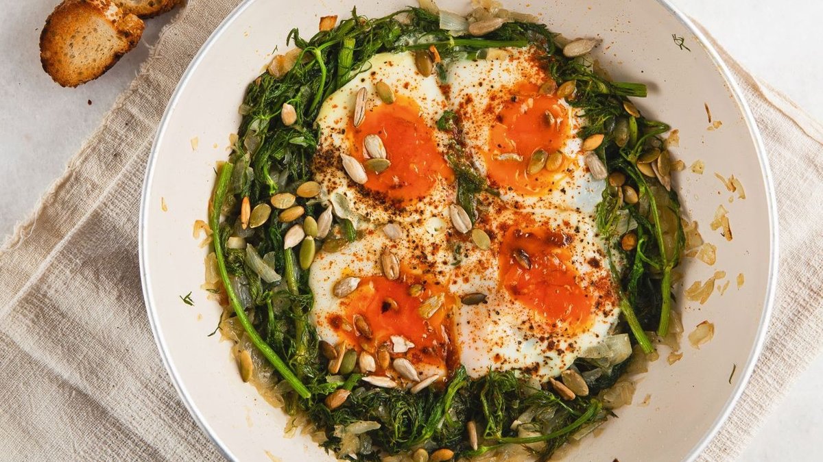 Yumuşayan otlar suyunu çektiğinde 4 adet yuvarlak göz açın. Yumurtaları bu gözlere kırın. Tencerenin kapağını 1 dakika kapalı tutarak pişirin. Üzerine eritilmiş tereyağı gezdirin. Sıcak olarak servis yapın.