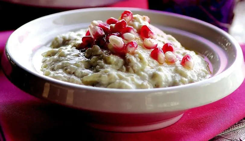 Patlıcanları közleyip, kabuklarını temizleyin. Küp doğrayıp derin bir kaba alın. Üzerine kıyılmış sarımsak, süzme yoğurt ve tuzu ilave edip, çırpma teli ile karıştırın. Limon suyu ve tahini ekleyip, patlıcanı fazla ezmeden karıştırın. Servis tabağına alıp üzerine zeytinyağı gezdirin. Narla süsleyip servis yapın.