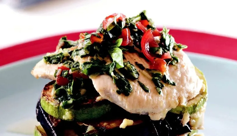Temizlenmiş kabak ve patlıcanları halka şeklinde kesin. Patlıcanları acısının çıkması için tuzlu suda 15 dakika bekletin. Elinizle sıkıp, fazla suyunu alın. Tavuk etlerini daire şeklinde kesip, kızdırılmış yağda kızartın. Aynı yağda kabağı ve patlıcanı da kızartın. Ayrı bir tavada tereyağını eritin ve unu 1 dakika kavurun. Sütü ekleyin, koyu bir beşamel sos hazırlayın. Sebze ve etin aralarına beşamel sos gezdirip, üst üste dizin. Fesleğen sos için fesleğen, sarımsak, zeytinyağı ve hardalı robottan geçirin. Tuz ve karabiberini ayarlayın. Yemeğin üzerine gezdirin ve sıcak olarak servis yapın.