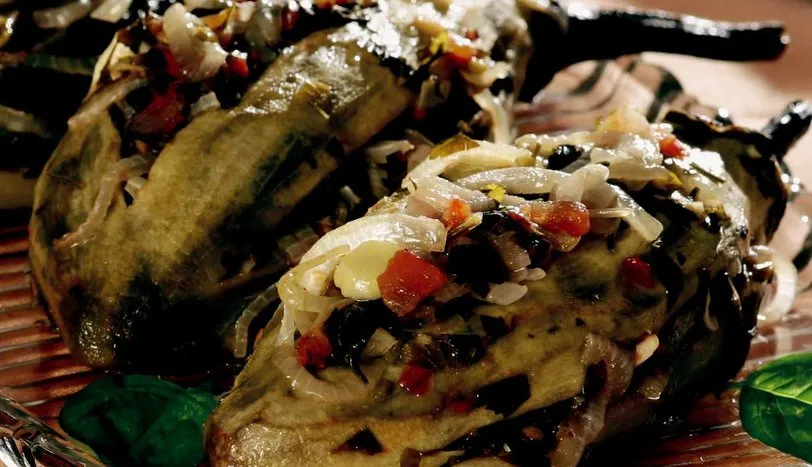 Patlıcanların sapları üzerinde kalacak şekilde tamamen soyun. Önce yanlarından, daha sonra üstlerinden bıçakla ikiye kesin. Bunu yaparken baş ve uç kısımlarını tamamen kesmeyin. Soğanları jülyen doğrayın. Sarımsağı ve maydanozu ince ince kıyın. Biber ve domatesleri minik doğrayın. Zeytinyağı ve su dışındaki tüm malzemeleri karıştırın. Hazırladığınız harcı dört tarafından patlıcanların içine doldurun. Tencereye aldığınız patlıcanların üstüne zeytinyağını gezdirin. 2 su bardağı suyu da ekleyip 10 dakika harlı, daha sonra kısık ateşte pişirin.