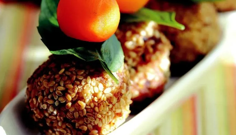 Patatesleri haşlayıp ezin. Havuç, kabak ve kırmızı biberi küçük doğrayın. Sarımsak ve soğanı kıyın. Sebzeleri zeytinyağında 5 dakika soteleyin. Üzerine 2 adet çırpılmış yumurta sarısı, 3 çorba kaşığı nişasta, tuz, karabiber ve patatesi ilave edip karıştırın. Elinizle pürüzsüz oluncaya kadar yuvarlayın. Önce kalan nişastaya, sonra çırpılmış 3 adet yumurtaya ve susama bulayın. Patates toplarını kızgın sıvı yağda, altın sarısı renk alana dek kızartın. Kağıt havlu üzerine çıkartın. Nane yaprağı ve havuç toplarıyla süsleyip, ılık olarak servis yapın.
