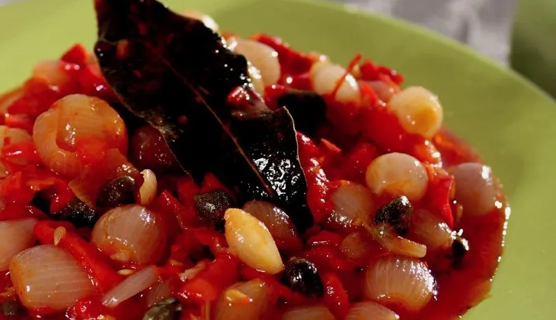 Ayıklanmış arpacık soğanları zeytinyağında hafifçe kavurun. İçine iri kıyılmış kırmızı biberi ve defne yaprağını ilave edin. Kapari, ince kıyılmış domates ve naneyi ekleyip kavurmaya devam edin. Nar ekşisi, tuz, karabiber ve pul biberi de koyup kısık ateşte 10-15 dakika pişirin. Servis tabağına aldıktan sonra susamla karıştırılmış yoğurtla birlikte servis yapın.