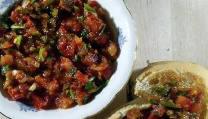 İlk olarak domateslerin kabuklarını soyup, minik küpler şeklinde doğrayın. Olabildiğince küçük küpler kesmeye çalışın. Bir süzgece koyup suyunun iyice akmasını sağlayın.Sonra biberleri, soğanı, sarımsağı ve maydanozu ince kıyıp suyu iyice süzülmüş domateslerle birlikte bir kaba koyup karıştırın.