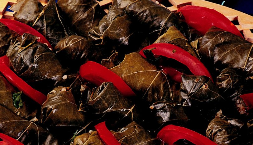 20 dakika dinlendirip, sumak ilave edin. Bu arada sosu hazırlayın. Biberleri közleyip robottan geçirin. Bir kapta yumurta sarısı, ezilmiş sarımsak, limon suyu, şeker, tuz ve zeytinyağını çırpın. Buna robotta ezilmiş biberleri ekleyip, karıştırın. Bir tabağa asma yapraklarını dizin. İçlerine hazırlanan bulgurlu karışımdan yeteri kadar koyun. Yaprakları sarın. Servis tabağına alın. Yanına hazırlanan sosu koyun ve bu sosa çiğ sarmaları bulayıp, servis yapın. - 2