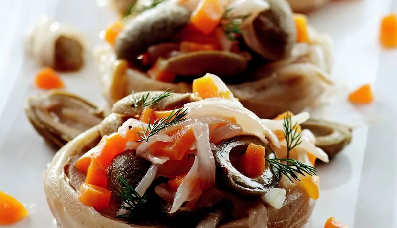 Piyazlık doğranmış soğanı tencereye alın. Üzerine enginarları yerleştirin. İkiye bölünüp çekirdekyatakları çıkarılmış çağlayı serpiştirin. Küp doğranmış havuç, kesme şeker, limon suyu, beyaz biber, zeytinyağı ve tuz ilave edin. Üzerini geçecek kadar su ekleyin. Yağlı kağıdı ıslatıp elinizle suyunu sıkın. Buruşuk şekilde yemeğin üzerine yayın. Kaynayana dek harlı, kaynadıktan sonra kısık ateşte, toplam 40dakika pişirin. Piştikten sonra enginarları servis tabağına alın. Üzerine, tenceredeki çağlalı harcı yerleştirin.Dilediğiniz şekilde süsleyip servis yapın