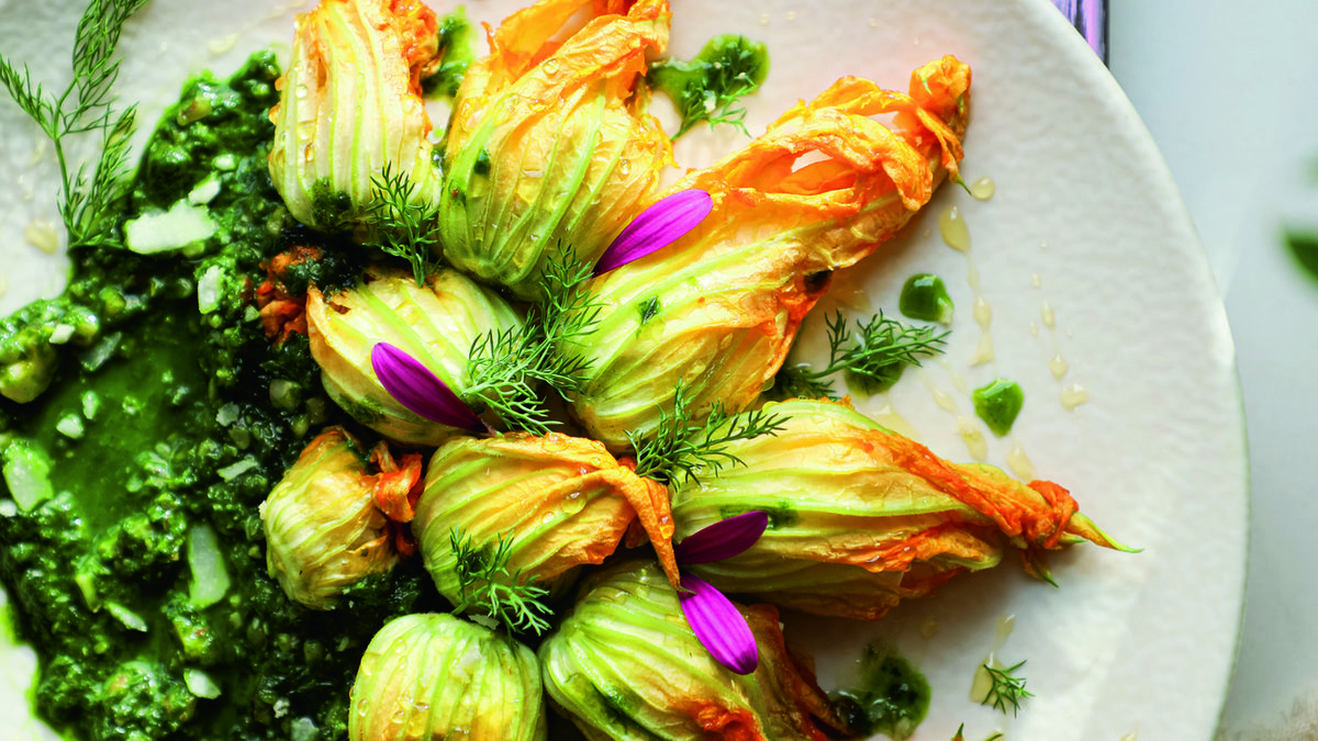 Ege’nin taptaze otlarıyla hazırlanan, pestoyla lezzeti katlanan hafif ve zarif bir yaz mezesi: Otlu Pestolu Kabak Çiçekleri!