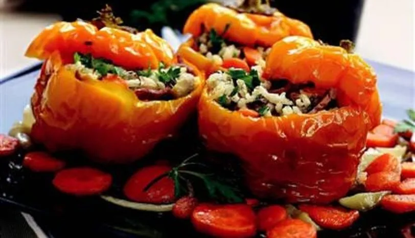 Biberleri bol kızgın sıvı yağda, kabukları kabarıp, kızarana dek, fazla yumuşatmadan kızartın. Kağıt havlu üzerine çıkarıp, fazla yağını alın. Ilındıktan sonra saplarını düzgün şekilde kesin. Tohum yataklarını çıkarın. İç harcı hazırlamak için, zeytinyağının yarısını tavada kızdırın. İçine piyazlık doğranmış iki buçuk soğanı ilave edin. Soğanın rengi dönmeden üzerine dilimlenmiş mantar, şeritler halinde doğranmış jambon, pirinç, tarçın ve kesme şekeri ekleyin. 4-5 dakika kavurun. Su ilave edip, pişmeye bırakın. Tuz ve beyaz biberi ekleyip, ocağın altını kapatın. 5 dakika dinlendirin. Hazırlanan iç harcı biberlerin içine pay edip, fazla sıkıştırmadan doldurun. Keserek çıkardığınız sap kısımlarını kapak olarak kullanın. Ayrı bir yerde sebze demeti için pırasayı ortadan ikiye ayırın. Tüm sebzeleri pırasanın arasına yerleştirip iple bağlayın. İpin ucundan uzun bir kısım bırakın. Fırın tepsisine veya fırına girebilen tencerenin dibine iki buçuk piyazlık doğranmış soğan ve dilimlenmiş havuçları yerleştirin. Üzerine biber dolmalarını ve sebze demetini koyun. Et suyu ve kalan zeytinyağını ilave edin. Tencerenin ağzını yağlı kağıtla kaplayıp, kapağını kapatın. Önceden ısıtılmış 180-200 derece fırında 1 saat pişirin. Fırından alıp, ağzı kapalı olarak ılınmaya bırakın. Ilık olarak servis yapın.