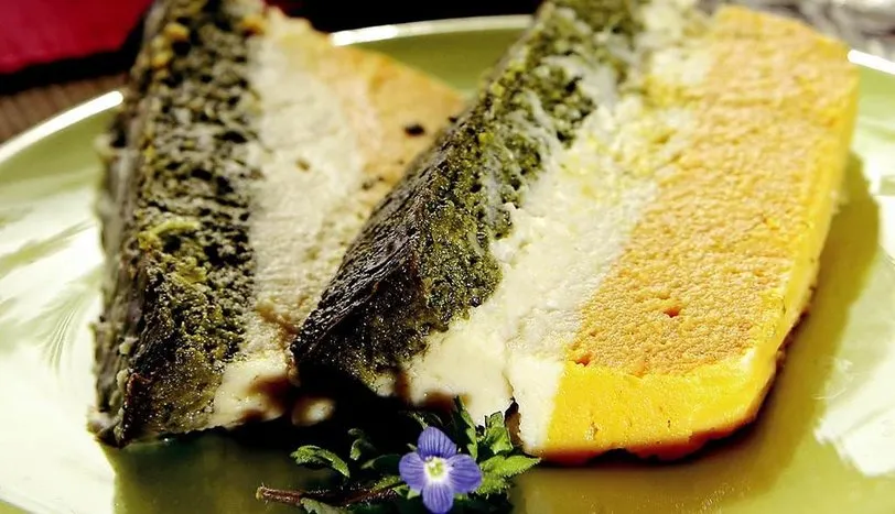 Dikdörtgen bir kek kalıbını 1 çorba kaşığı eritilmiş tereyağı ile yağlayın ve yağlı kağıtla kaplayın. Fırçada kalan yağla, kağıdın üzerini çok hafif yağlayın. Daha sonra buzdolabına kaldırın. Soğanları yemeklik doğrayın. Bir tencereye 2-3 parmak su koyup kaynatın. Bir taşım kaynayınca üzerine buharda pişirme telini yerleştirin. Havuçları koyup, üzerine doğradığınız soğanın 1/3'ünü koyun. Tencerenin kapağını kapatıp 16-18 dakika pişirin. Daha sonra suyunu bırakması için kağıt havlu yayılmış bir tabağa alın. Tencerenin suyu azalmışsa yeniden aynı ölçüye tamamlayın. Kaynamaya başlayınca, üzerindeki buharlı pişiriciye, çiçeklerine ayrılmış karnabaharı ve kalan soğanın yarısını ekleyin. 20 dakika pişirip yine kağıt havlu üzerinde süzdürün. Blendere 1 adet yumurta ve 2 adet yumurta akını alıp, 30 saniye karıştırın. İyice süzülmüş havuçlu soğanı, hindistan cevizini, tuz ve karabiberi ekleyip 30 saniye daha çekin. Buzdolabındaki kek kalıbını çıkarıp havuçlu karışımı içine dökün. Yüzeyini spatula ile düzeltin. Blendere yeniden 1 adet yumurta ve 1 adet yumurta akı koyup 30 saniye karıştırın. Üzerine karnabaharlı soğan, parmesan ve tuz ekleyip birlikte çekin. Bu karışımı da havuç püresinin üzerine yavaşça ekleyip üzerini düzeltin. Kalıbı kenara alın. Kenarları yüksek bir fırın kabına su koyup önceden ısıtılmış 180 derece fırına verin. Ispanağı yıkayıp irice kıyın. Bir tencereye alıp üzerine 1 çorba kaşığı su koyun. Kapağını kapatıp 2-3 dakika pişirin. Tencereyi ocaktan alın ve ıspanağı elinizle sıkıp suyunu süzün. Kalan tereyağını kalın dipli bir tencereye alıp eritin. Üzerine kalan doğranmış soğan, taze soğan ve ince kıyılmış sarımsağı ekleyin. 2-3 dakika kavurun. Üzerine ıspanağı ekleyip karıştırın ve ocaktan alın. Kalan 1 adet yumurta ve 1 adet yumurta akını blenderde 30 saniye karıştırın. Ispanağı ekleyip yeniden çekin. Karışımı kalıptaki karnabaharın üzerine düzgünce yerleştirin ve ıslak bir spatula ile düzletin. Kalıbın üzerine kenarlardan taşmayacak büyüklükte bir yağlı kağıt kapatın. Kek kalıbını fırındaki tepsiye yerleştirin ve 1 saat 10 dakika pişirin. Fırından alıp 20 dakika dinlendirin. Bir bıçağın tersini kalıbın kenarlarından geçirin ve servis tabağına ters çevirerek alın. Soğuduktan sonra dilimleyerek servis yapın.
