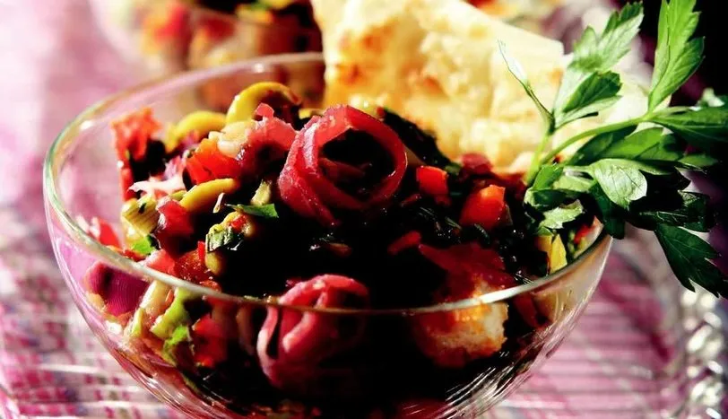 Taze soğan ve maydanozu incecik kıyıp salata kasesine alın. Yeşil zeytin ilave edip, karıştırın. Kırmızı ve sarı biberi küp doğrayıp, üzerine ekleyin. İnce kıyılmış pastırma ve cevizi katıp, karıştırın. Bir kasede biber salçası, nar ekşisi ve tuzu karıştırın. Zeytinyağını ekleyin ve bu sosu salatanın üzerine gezdirin. Pide ya da ekmek dilimini üçgen şeklinde kesin ve sıcak fırında kızartıp, salatayla birlikte servis yapın
