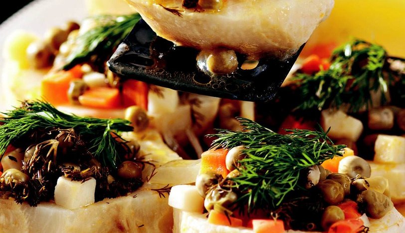 Ortalarına garnitürü pay edin. Kıyılmış dereotu serpiştirip, üzerine portakal suyu gezdirin. Kısık ateşte, ortalama 25 dakika pişirip, soğuk olarak servis yapın.