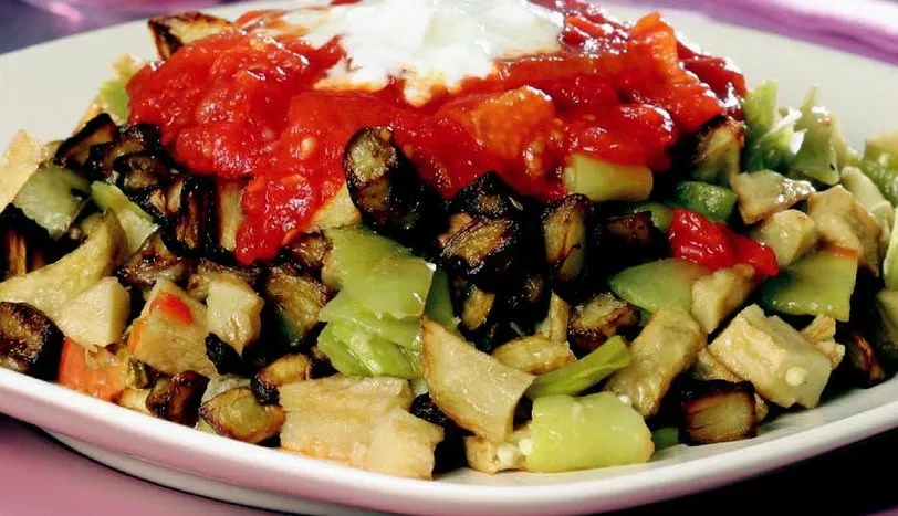 Patlıcan ve kabakların kabuklarını soyun. Biberlerle birlikte küp doğrayın. Kızgın zeytinyağında ayrı ayrı kızartıp servis tabağına alın. Soğanı yemeklik doğrayıp içine sarımsağı kıyın ve zeytinyağında kavurun. Küp doğradığınız domatesleri ekleyip 1-2 dakika daha karıştırın ve ateşten alın. Naneyi ilave edin. Sos biraz soğuduktan sonra kızartmaların üzerine ekleyin ve karıştırın. Yoğurtla birlikte servis yapın.