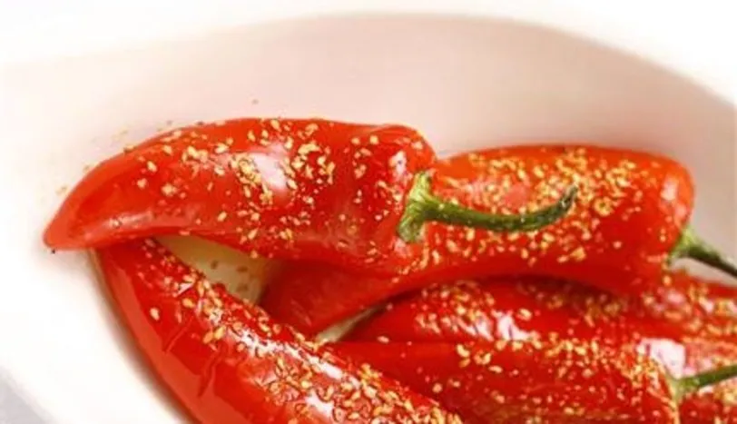 Magicook'a 2 cup suyu aktarın, üzerine sirke ve kıyılmış sarımsağı ilave edin. Magicook buhar sepetine kırmızı biberleri yerleştirin. "menü"den "buharlı" modunu seçip pişirme süresini 15 dakikaya ayarlayın ve "başlat" düğmesine basın. 15 dakika bekledikten sonra biberi servis tabağına aktarın. İsteğe göre yağsız olarak tavada kavrulmuş susam ile süsleyin, zeytinyağını gezdirerek dökün. Soğuk servis yapın.