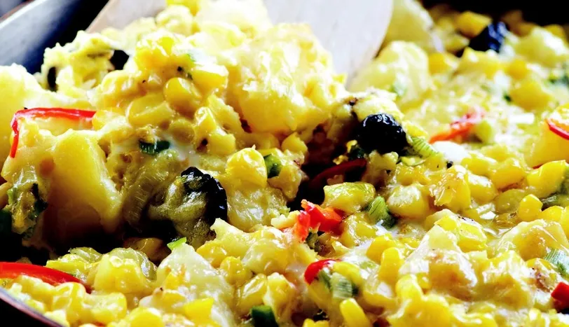 Sütün bir çay bardağını kenara ayırın. Kalan sütü bir tencereye alın. Üzerine su ve toz şekeri ekleyip, mısırları 30 dakika haşlayın. Soğuduktan sonra bir bıçak yardımıyla, taneleri sıyırarak koçandan ayırın. Diğer taraftan patatesleri haşlayıp kabuklarını soyun. Soğanları ince halka şeklinde, biberleri jülyen doğrayın. Zeytinlerin çekirdeklerini çıkarıp ikiye bölün. Yumurtaları bir kaba kırın ve ayırdığınız sütle çırpın. Üzerine arzunuza göre acı biber sosu ve tuz katın. Tereyağını fırına girmeye uygun bir tavaya alıp kızdırın. Üzerine iri doğranmış patates ilave edip 10 dakika sote edin. Mısır taneleri, biber, soğan, zeytin ve tuz ekleyip birkaç dakika daha kavurun. Kaşarı ilave edin. Çırpılmış yumurtayı katıp, karıştırın. Tavayı önceden ısıtılmış 200 derece fırına koyup, 20 dakika pişirdikten sonra servis yapın.