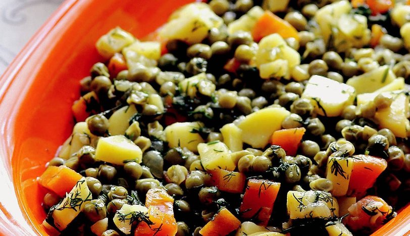 Soğanı yemeklik, havuç ve patatesi küp doğrayın. Zeytinyağını tencereye alıp, soğanları pembeleştirin. Küp doğradığınız havuçları ilave edip kavurmaya devam edin. Ayıkladığınız bezelyeyi, patatesi, toz şekeri, tuzu ve suyu ekleyin. Kaynamaya başladığında kısık ateşe alıp suyunu çekene dek pişirin. Kıyılmış dereotuyla karıştırıp, soğuk servis yapın.