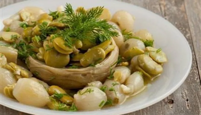 2. Temizleme işlemi bitice, enginarları bir tencereye yan yana yatırarak daire şeklinde dizin. İç baklaları kabuklarından ayırın, soğanları soyun ve enginarların üzerlerine ilave edin. Zeytinyağını ve yarım limonun suyunu ekleyin. Bir su bardağı sıcak suyu dökün ve tencerenin kapağını kapatarak kısık ateşte pişirin (enginarlar ve baklalar yumuşayana kadar). Daha sonra ateşten alarak soğumasını bekleyin.