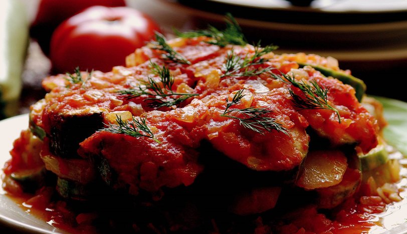 Soteleme işlemine devam edin. Tuz ve toz şekeri ekleyip karıştırın. Domatesli malzemenin üzerine bir sıra patates, bir sıra kabak dizin. Üzerine suyu gezdirip kısık ateşte pişirin. Tencereyi ocaktan almadan önce dereotunu ekleyin. Tencerenin kapağı kapalı bir şekilde ılınmaya bırakın.