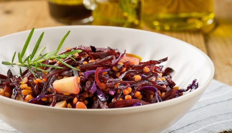 Aynı tavada ince kıyılmış lahana ve kabuğu ile birlikte küp doğranmış elmayı yağsız olarak soteleyin. Daha sonra pancarın üzerine ilave edin. Mercimeği de ekleyip harmanlayın ve servis tabağına alın. Sos için tüm malzemeyi çırpın. Salatanın üzerine gezdirip servis yapın.
