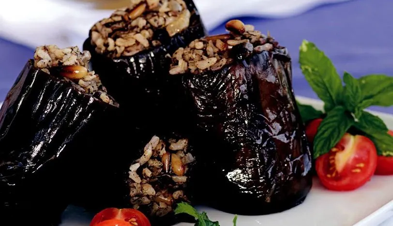 Dolmanın iç harcını hazırlamak için pirinci ve kuş üzümünü ayrı ayrı kaplarda sıcak suya koyup soğuyana kadar bekletin. Zeytinyağını bir tencereye alıp, ince kıyılmış soğanları kavurun. Üzerine süzülmüş pirinç ve dolmalık fıstıkları ekleyin. Pirinç beyazlaşana dek kavurun. Maydanoz, dereotu, nane, kuş üzümü, karabiber, yenibahar, tarçın, toz şeker ve tuz ekleyip karıştırın. 1 kahve fincanı sıcak su ilave edin. Kısık ateşte suyunu çekene kadar pişirin. Diğer taraftan patlıcanları yıkayıp kurulayın. Düz bir zemine koyup üzerine elinizle bastırarak oklava yuvarlar gibi yuvarlayın (bu işlem, patlıcanların içlerini daha kolay boşaltmanızı sağlar). Daha sonra patlıcanları ikiye bölüp içlerini boşaltın. Hazırladığınız içi patlıcanlara paylaştırın. Tencereye yerleştirip üzerine 1 su bardağı sıcak su ekleyin. Kapağı kapalı olarak çok kısık ateşte 1 saat pişirin. Soğuk ya da ılık olarak servis yapın.