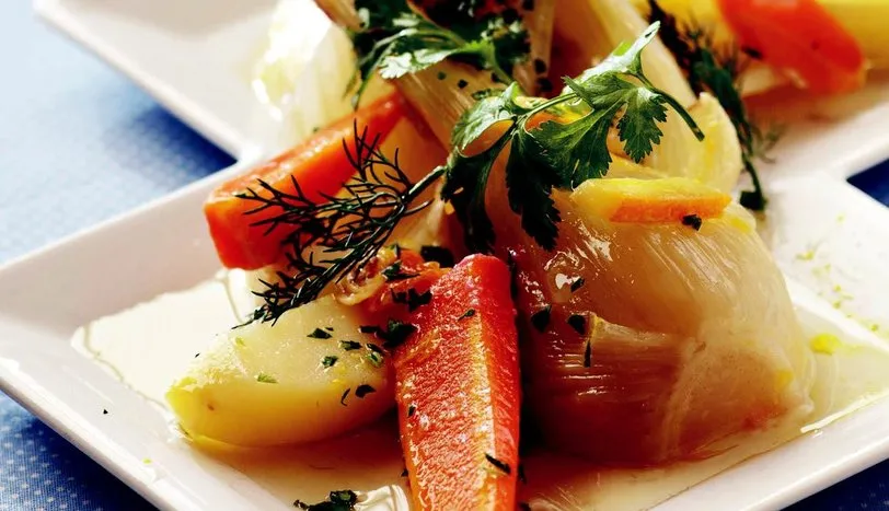 2 Tencerenin üzerine sebzelerin kararmasını önlemek için ıslak bir yağlı kağıt yerleştirip, kapağını kapatın. 20 dakika pişirip ince doğranmış portakalı tencereye ekleyin. 10 dakika daha pişirip ocaktan alın. Soğuduktan sonra kıyılmış maydanoz ve dereotu ile servis yapın.