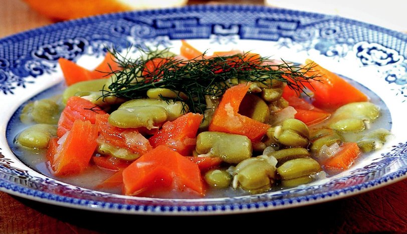 Baklaların dış kabuklarını ayıklayın ve yıkayın. Soğan ve sarımsakları ince kıyın, 1 kahve fincanı zeytinyağında kavurun. Havucu küp şeklinde küçük doğrayarak, kavrulan soğana ekleyin. Birlikte 2 dakika daha kavurun. Sırasıyla unu, baklayı, limon suyunu, tuzu ilave edin. Birlikte 10 dakika kaynatın. İnce kıyılmış dereotuyla süsleyip ılık olarak servis yapın.