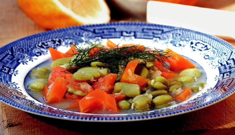 Baklaların dış kabuklarını ayıklayın ve yıkayın. Soğan ve sarımsakları ince kıyın, 1 kahve fincanı zeytinyağında kavurun. Havucu küp şeklinde küçük doğrayarak, kavrulan soğana ekleyin.