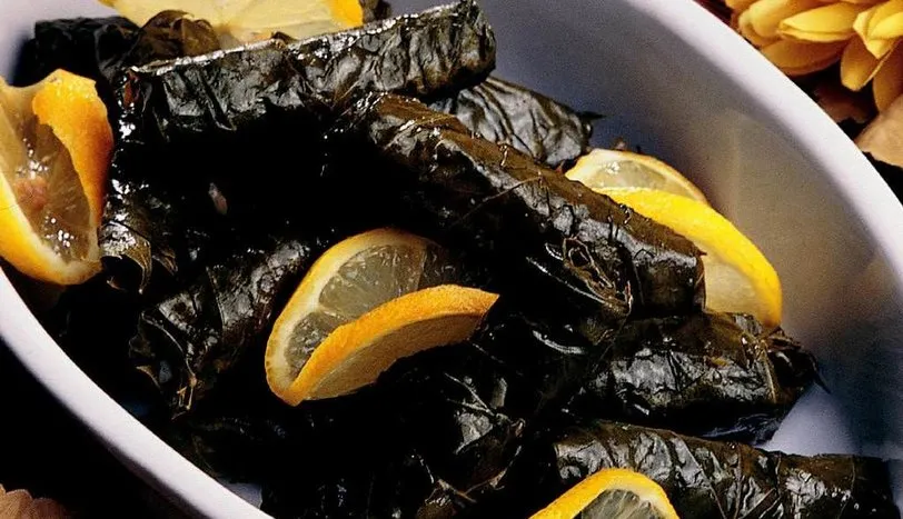 Üzüm yaprakları taze ise kaynar suda 3 dakika tutup çıkartın. Salamuranın tuzunu almak için 1-2 saat suda bekletin. Ardından yumuşaması için 10 dakika kaynatın. Soğanları küp doğrayıp zeytinyağında pembeleşene kadar kavurun. Pirinci ilave edip taneler beyazlaşana kadar kavurun. Üzerine salça ve kuş üzümü ekleyip kavurmayı sürdürün. Sonra dolmalık fıstığı, baharatları, tuzu, toz şekeri ve kıyılmış dereotunu ekleyin. Bir iki kere çevirip ocaktan alın ve soğumaya bırakın. Yaprakları açıp içlerine yeterli miktarda harç koyun ve çok sıkı olmayacak şekilde sarın. Hazırladığınız sarmaları tencereye dizip üzerine bir ağırlık yerleştirin. Üstünü geçecek kadar soğuk su ekleyin. Ocağa oturtup orta ateşte pişmeye bırakın. Kaynadıktan sonra kısık ateşe getirip, 25 dakika daha pişirin. Altını kapatıp 10 dakika dinlendirin. Suyunu süzün. Tamamen soğuduktan sonra servis yapın.