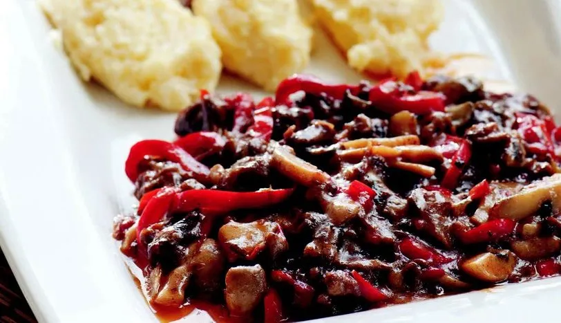 Soğan ve sarımsağı ince kıyın. Eti jülyen doğrayıp, tavaya alın ve suyunu çekene kadar pişirin. Üzerine tereyağını ekleyin. Soğan ve sarımsağı ekleyip, pişirmeye devam edin. Demi glace sosu